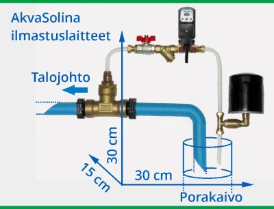 Ratkaisu ei vaadi erillistä ilmakompressoria, pumppuja tai säiliöitä, koska kaivoa käytetään puhdasvesireservinä ja veden kierrätys hoidetaan kaivossa olevalla pumpulla. Tällä laitteella kaivoveden puhdistus on helppoa!