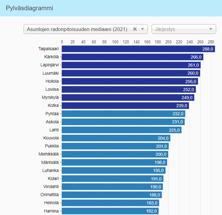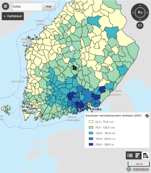 Tiedätkö alueesi radonpitoisuuden kaivovedessä? Tutustu oheiseen karttaan ja asuntojen radonpitoisuuksiin eri paikkakunnilla (Lähde: STUK, pohjakartta: Maanmittauslaitos Suomen radonkartat – STUK)