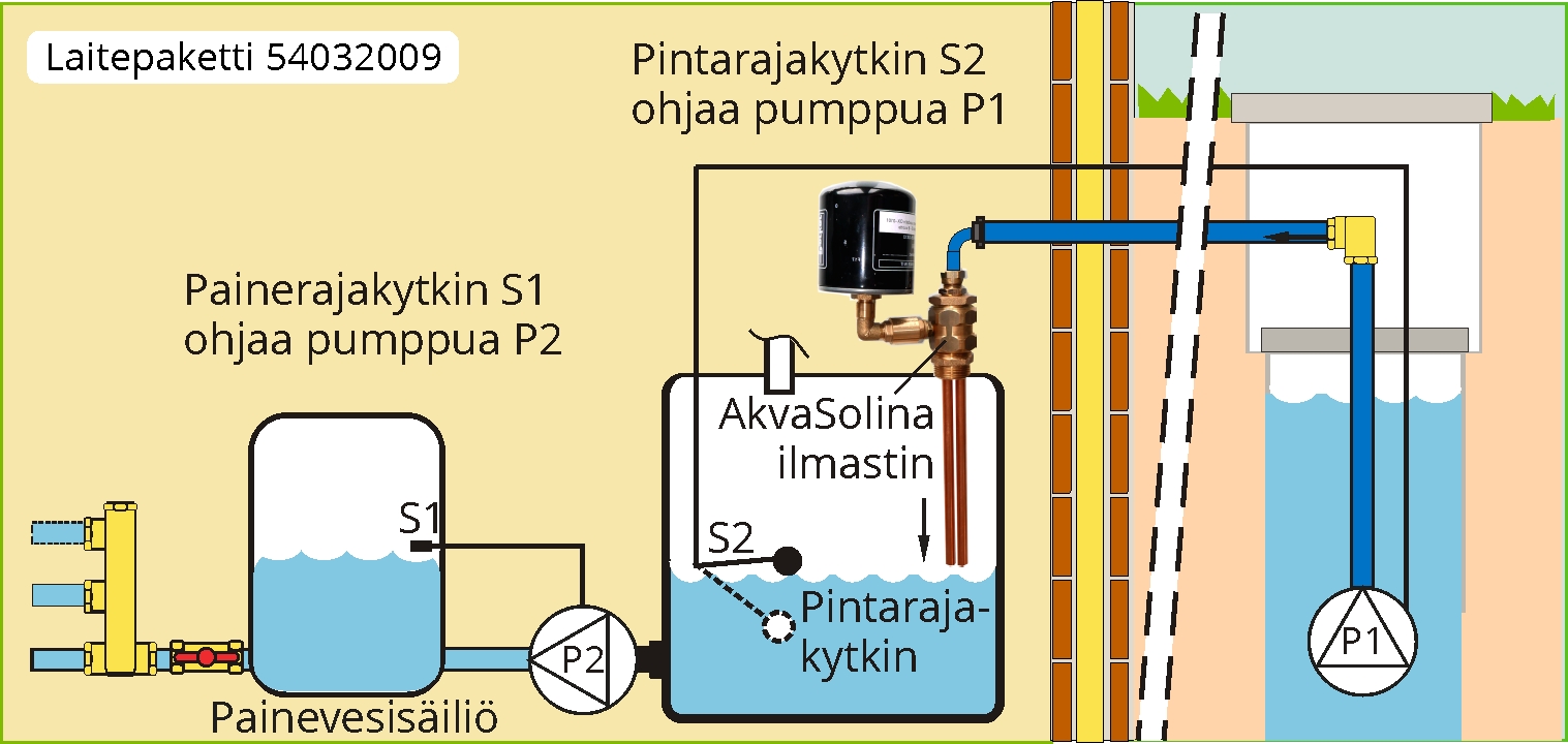 Ilmastetun veden säiliöksi ja kulutukseen lähtevän linjan paineenkorotuspumpuksi asiakas voi vapaasti hankkia parhaaksi katsomansa säiliökoot ja ratkaisut. AkvaSolina ilmastuslaitteet eivät vakiona sisällä säiliötä eikä paineenkorotuspumppua. Tarjoamme myös kokonaisratkaisua joka sisältää myös vesisäiliön ja paineen korotuspumpun.