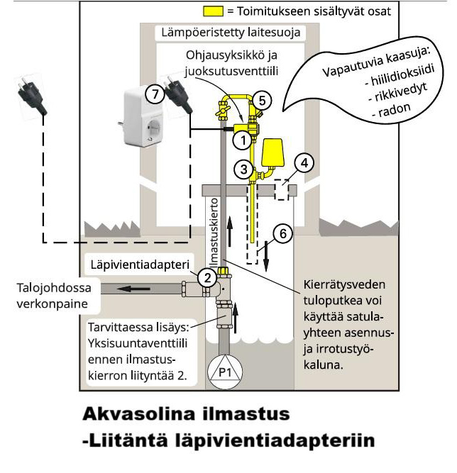 -AkvaSolina radonilmastin asennetaan yleensä porakaivolle. AkvaSolina malli liitäntä talonjohdosta voidaan asentaa porakaivon huoltokaivoon ja liitäntä läpivientiadapteriin malli asennetaan porakaivon päälle(laite tarvitsee suojata asennuksen jälkeen).